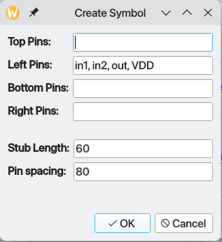 Our advice is not to change stub length and pin spacing values between symbols to keep consistent within a design library. Of course, you could assign subcircuit pins as you see fit between top, left, bottom and right sides. A basic symbol is created ready to be edited further.