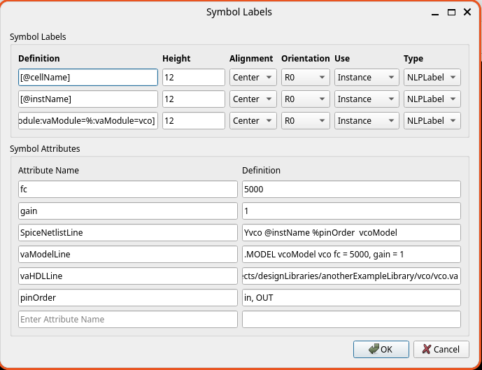 - XyceVerilogaNetlistLine: This attribute is the template for the netlisting of this symbol when Verilog-a cellview is used.