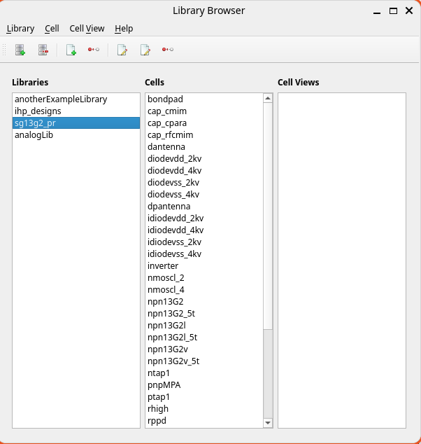 Cellmenu item has two items:New Cell…is used to create a new cell. It starts a dialogue to choose the library cell will be placed and its name. In the file system, it creates an empty folder under the library folder.Delete Cell…starts a dialogue to choose which cell will be deleted. When a cell is deleted, its child cellviews are also deleted. This is not reversible unless a revision control system is in place.