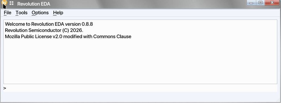 and Help menus are usable. Revolution EDA main window also includes a Python REPL interpreter.